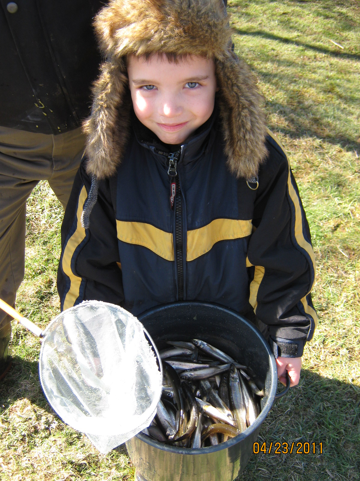 This morning we had just finished breakfast when Bernie called to say the smelts were running in the stream by his place. So we picked up a dipping net at his place and headed out. Once Tristen got the idea of scooping the fish out of the water, he had a great time! We half filled a large pot and brought them home to have for lunch later. Lloyd planned to clean the smelts and Tristen and I went back over to Fort Augustus to go to the playground. Little did we know there was going to be an Easter Egg hunt and we arrived to a park filled with kids and just a few too minutes too late to find any eggs. Needless to say he was quite disappointed and no longer wanted to stay and play. Instead we went home and I made him stay inside while I hid some eggs around the yard outside. I had bought some plastic eggs with little packages of chewy fruit candy inside and he quite enjoyed going around the yard and finding the egs. It helped to alleviate the stress of having to wait for Easter.